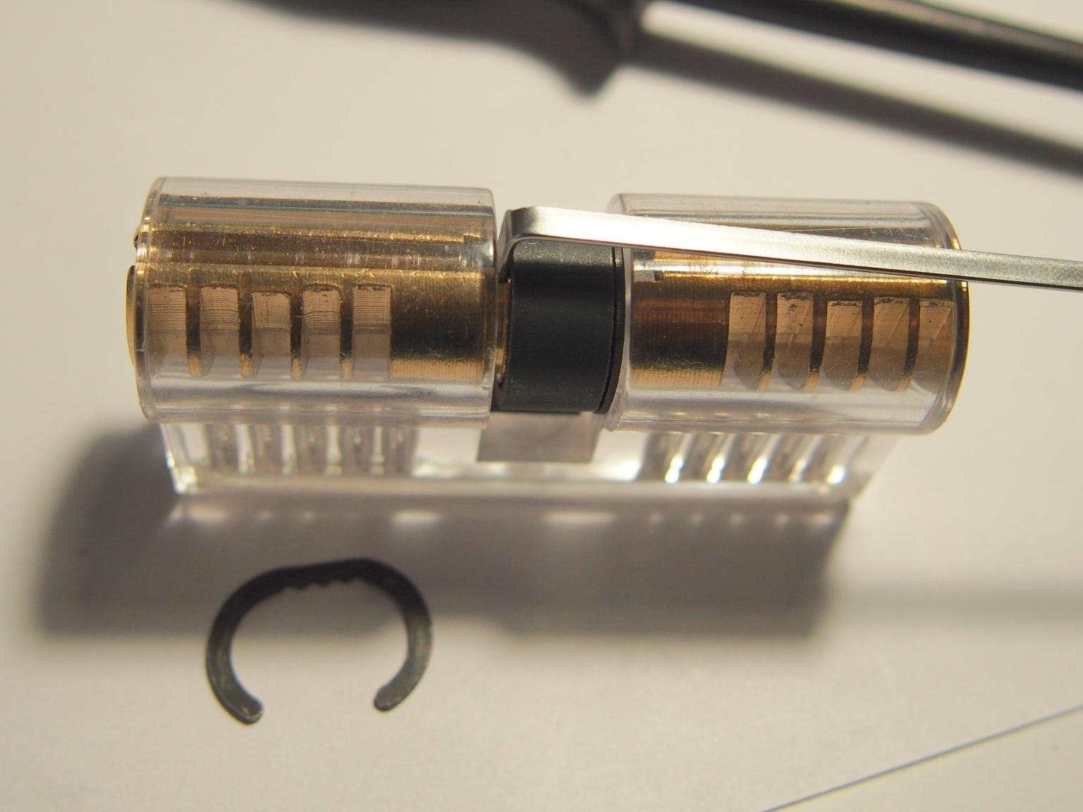 Bubínky v zámku drží dva jistící kroužky uprostřed. Ty se odstraní zasunutím konce napínáku do mezírky v jádře, což znemožní volné otáčení kroužku a postupným rozevřením šroubovákem. Jelikož všechny blokovací kolíky v zámku jsou stejné, není nutné zapamatovat si jejich pořadí a bubínek lze rovnou vytáhnout.