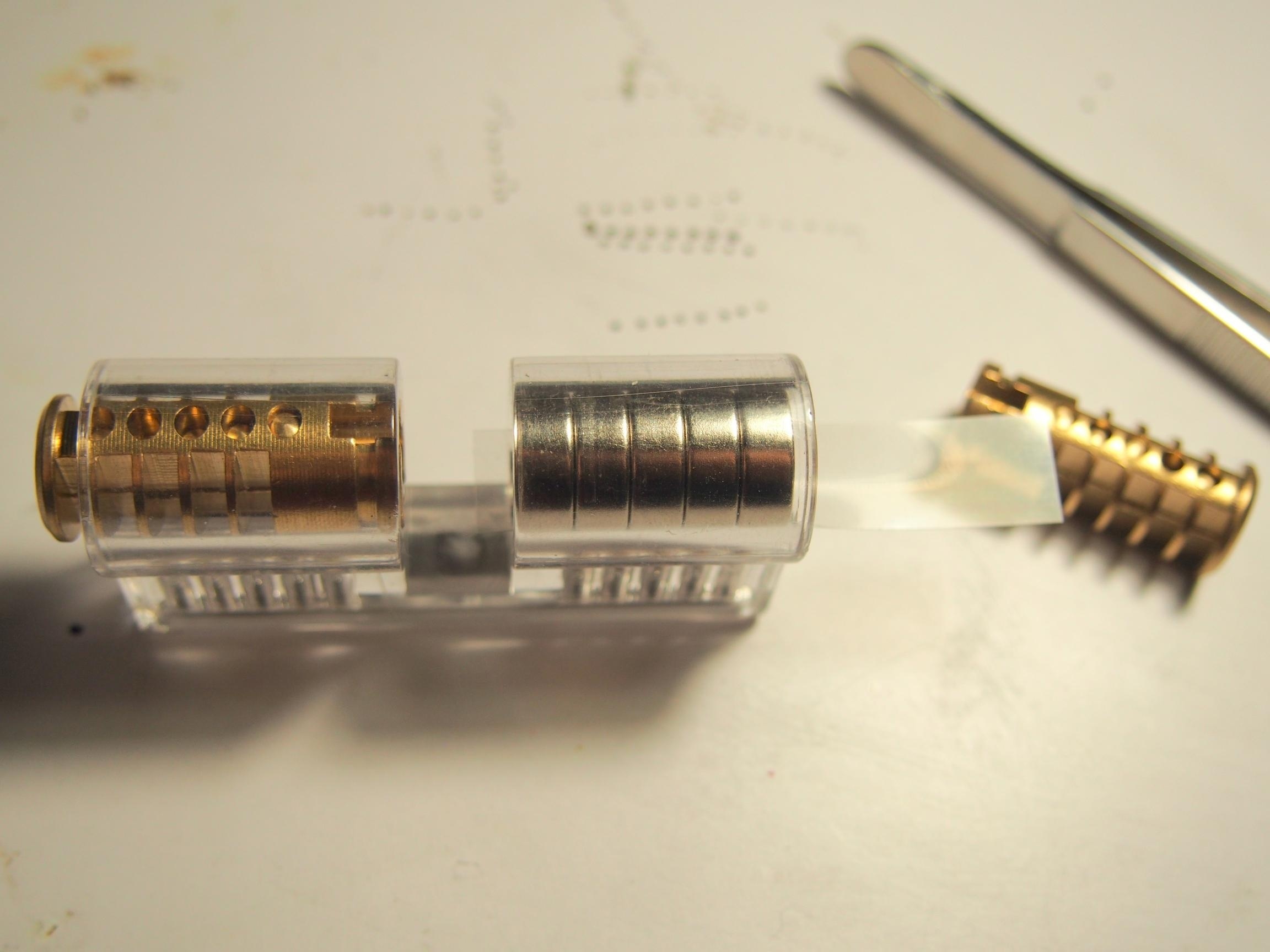 Levá a pravá strana zámku má odlišné klíče a bubínky mají složitější tvar klíčové dírky. Pocit z vyhmatávání se mnohem více blíží skutečnému zámku a po úpravě lze piny v zámku snadno měnit. Navíc velikost stavítek (2.8 mm) je kompatibilní s náhradními stavítky a bezpečnostními piny Sparrows. Obrázek níže ukazuje vlevo piny z průhledného zámku a vpravo piny Sparrows. Rozebírání zámku před úpravou funguje stejně, jako u skutečné cylindrické vložky.